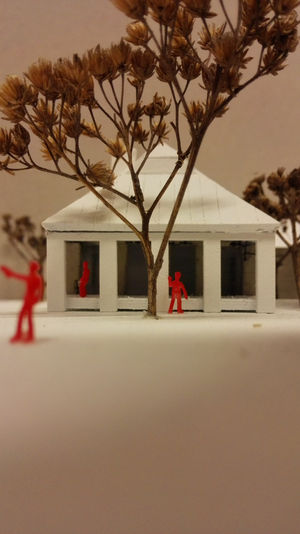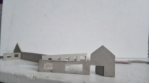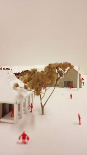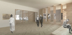 funkciami je spojená prvkom steny z pôvodnych materiálov, ktorý poukazuje na všetky dôležité objekty v centre a tým komplex získava jednotu.